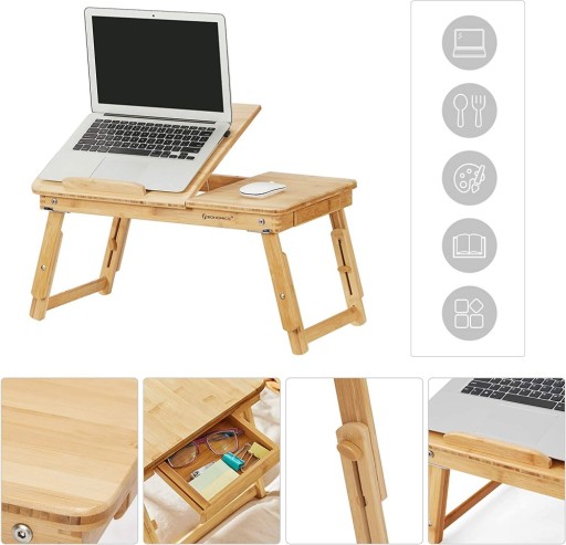 Surfowanie, praca, czytanie, śniadanie w łóżku, jedzenie na kanapie - ten stolik do laptopa idealnie nadaje się do wszystkich tych zajęć. Blat można ustawić pod 5 różnymi kątami. Dzięki listwie na krawędzi uchwytu Twój laptop lub książka nie zsuną się nawet jeśli przechylisz blat stołu. Wysokość nóg jest również regulowana bezstopniowo. Stół można również łatwo złożyć, gdy nie jest używany.