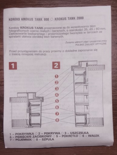 Koreksy do wywoływania filmów małoobrazkowych Krokus TANK 800 z pokrywką, także Krokus TANK 2000 z pokrywką oraz Krokus TANK 2000 bez pokrywki, koreksy używane, we wszystkich jest pokrętło, w jednym TANK 2000 brak pokrywy, producent PZO Warszawa. Światłoszczelność przy zdjętej pokrywie w każdym z koreksów do 2 lx. Koreksy będą zapakowane w tekturę, folię bombelkową oraz styropian - jedno opakowanie. Ze względu na wykonanie tego urządzenia warto przeczytać instrukcję. Wprowadzanie filmów do magazynków spiralnych wymaga wprawy, są one delikatne. Nie udzielam gwarancji, koreksy nie są uszkodzone mechanicznie.
