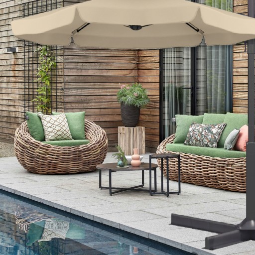 Parasole na wysięgniku idealnie spisują się jako zacienienie nawet nad bardzo rozbudowanymi zestawami mebli ogrodowych, na tarasach, balkonach lub po prostu w kąciku na działce.