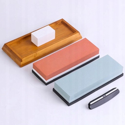 - W zestawie: Dwa kamienie z korundu, kamień spłaszczający, prowadnica do utrzymywania kąta, bambusowa podstawka