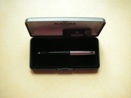 Długopis AURURA - czarny. Jeden z najbardziej eleganckich i najbardziej rozpoznawalnych wyrobów firmy AURORA. Typowy męski ciężki i duży. Całość jest starannie wykończona i elegancko zapakowana w firmowe plastikowe pudełko z logo firmowym AURORA na wieczku i we wnętrzu. Całość ładnie wykonana zwraca uwagę wysoka jakość. Zestaw świetnie się prezentuje zarówno na własnym biurku, ale też świetnie nadaje się na prezent. Świetne uzupełnienie do osobistych podręcznych akcesorii biurowych bądź do torebki lub teczki. Przedmiot nie noszący znamion użytkowania. Bez wad, duże walory estetyczne i użytkowe. Rzecz godny uwagi i polecenia.