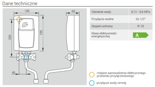 Podgrzewacz jest urządzeniem bezciśnieniowym, może współpracować tylko ze specjalną metalową baterią trójdrożną dołączoną do kompletu.