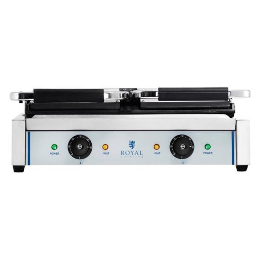 Urządzenie gastronomiczne marki Royal Catering, którym jest prezentowany grill kontaktowy, sprawdzi się w barach szybkiej obsługi, restauracjach, hotelach, lokalach bistro, a także w gospodarstwach domowych. Sprzęt nadaje się do przygotowywania grillowanych mięs, ryb, warzyw oraz pieczywa. Przy jego pomocy przyrządzisz m.in. przepyszne burgery, tortille, panini, pieczone kiełbaski. Model RCKG-3600-F wyposażono w dwa bardzo wydajne elementy grzewcze o mocy 1800 W każdy. Przyśpieszony wzrost ciepła, a także jego utrzymanie to zasługa również żeliwnej płyty grillowej z emaliowaną powłoką. W efekcie sporządzenie potraw zajmie niewiele czasu.