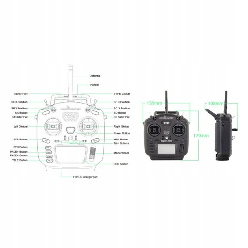 UWAGA : Pustka lewej ręki Nowy w TX12 MKII ★ Zaktualizowano tylną skrzynkę z wygodnymi uchwytami ★ Popraw uchwyty S1 / S2 ★ Ulepszone ładowanie USB-C QC 3.0 ★ Zaktualizowany projekt płyty głównej ★ Zaktualizowano MCU do STM32F407 ★ Zainstalowana fabryka Edgetx ★ W zestawie karta SD ★ Wewnętrzny moduł ExpressLrs RF TX12 MKII ELRS Specyfikacje: Rozmiar: 170*159*108 mm Waga: 363 g Częstotliwość: 2.400 GHz-2.480GHz Opcja układu RF: ExpressLRS (ELRS) Moc nadawcza: 20dBm Zysk anteny: 2dB Praca bieżąca: 320ma@8.4v Zakres napięcia: 6,6-8,4 V DC Zakres:> 2 km (w zależności od odbiornika) Oprogramowanie układowe radiowe: Edgetx (nadajnik) / Expresslrs (moduł RF) Kanały: do 16 (w zależności od odbiornika) Wyświetlacz: 128*64 Monochrome LCD wyświetlacz Gimbal: Gimbals High Precision Hall Moduł zewnętrzny: JR/FRSKY/Crossfire kompatybilny Metoda aktualizacji: karta USB/SD i Edgetx Buddy Online lub Edgetx Companion PC Oprogramowanie Ładowanie USB: QC3 USB-C Karta SD: wliczone