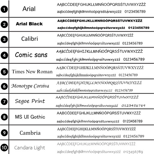 2. Podaj numer czcionki jeśli chcesz wygrawerować tekst lub datę oraz numer symbolu jeśli twój projekt zakłada jego użycie (listę dostępnych czcionek i symboli znajdziesz na grafice poniżej)