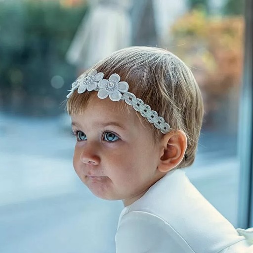 Opaska do chrztu w kolorze ecru ozdobiona ecru kwiatkami z kryształkami w środku.