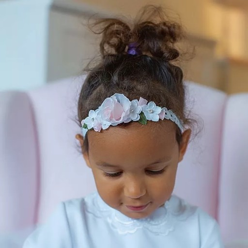 Opaska do chrztu w kolorze białym ozdobiona delikatnym bukiecikiem z biało-różowych różyczek