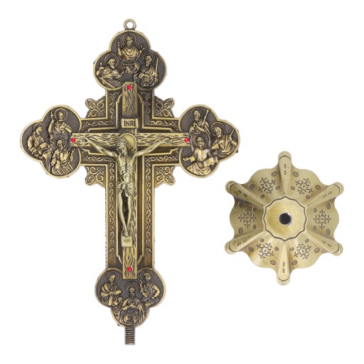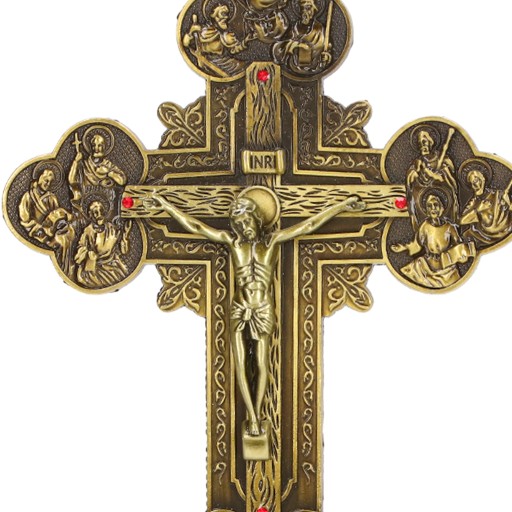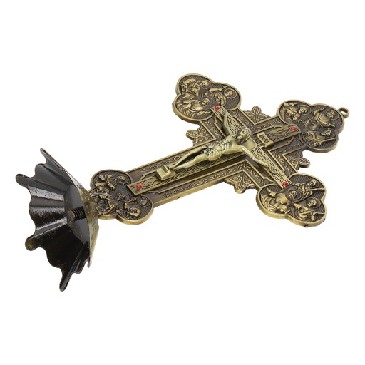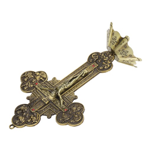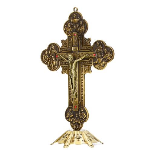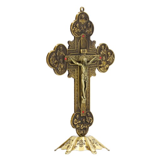 Бронзовое распятие на устойчивом основании, инкрустированное в красном винтажном стиле.