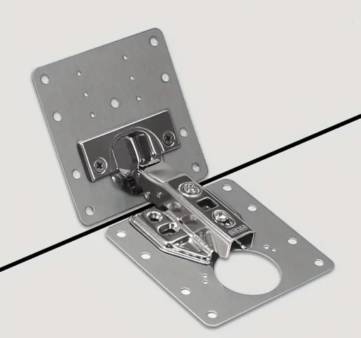 W płytce wycięte wszystkie potrzebne otwory do różnych modeli zawiasów. Płyta pasuje do zawiasów z centralnymi otworami przy puszcze zawiasu jak i przesuniętymi.