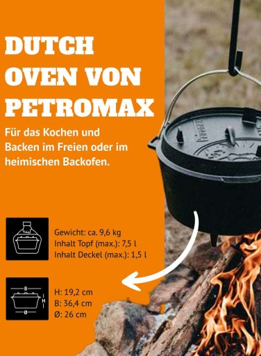 Oryginalny garnek żeliwny na nóżkach Petromax Dutch Oven FT3, często nazywany piekarnikiem holenderskim, idealnie nadaje się do gotowania i pieczenia na świeżym powietrzu lub w domowym piekarniku. Garnki żeliwne znane są już od XVIII wieku, już wówczas doceniono wyjątkowe właściwości żeliwa. Dzięki garnkowi żeliwnemu Petromax kontynuuje tą tradycję i wyposaża garnki w różnorodne wyrafinowane detale.