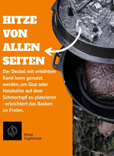 Podwyższona krawędź pokrywy umożliwia umieszczenie żaru lub węgla drzewnego na garnku. Oznacza to, że garnek nagrzewa się ze wszystkich stron i można w nim nawet upiec chleb.