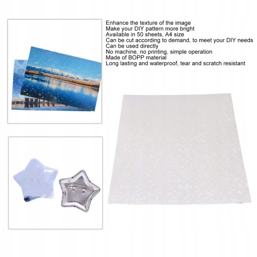 5. Materiał BOPP: holograficzne arkusze laminatu A4 wykonane z materiału BOPP, trwałe i wodoodporne, odporne na rozdarcia i zarysowania.