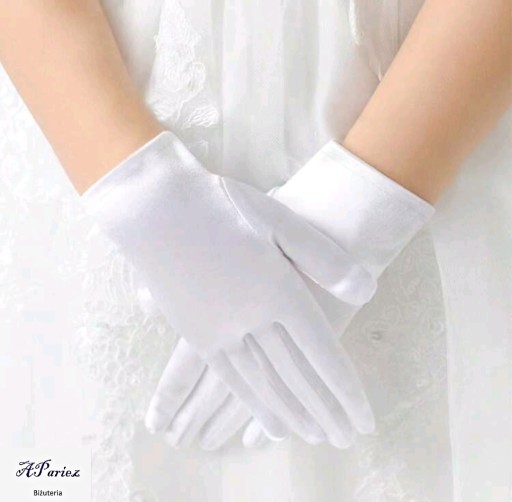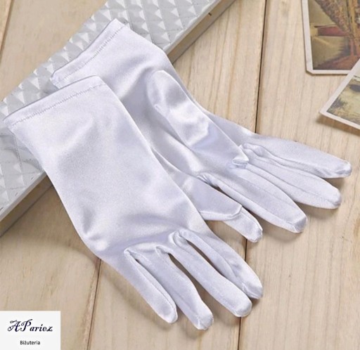 Popularnością cieszy się również model bez palców uszyty z delikatnego atłasu. Zdobienie koralikami, koronką i kwiatem podkreśla subtelność oraz skromność dziewczynek przyjmujących po raz pierwszy sakrament Komunii Świętej.