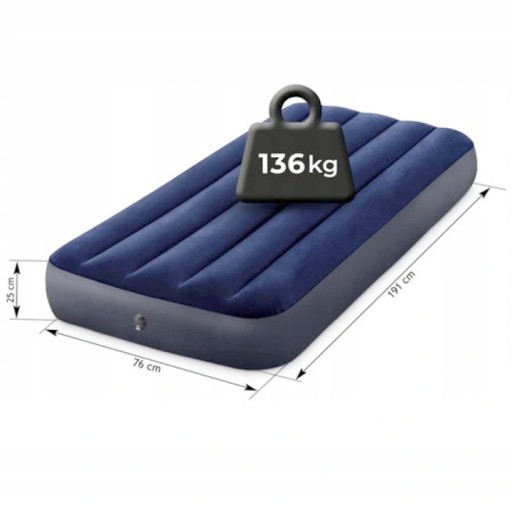 Materac idealnie nadaje się dla użytku przez jedną osobę. Jego wymiary to 191cmx76cmx25cm i do tego potrafi on utrzymać do 136kg!