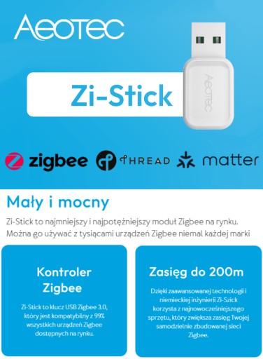 Dodatkowo Bramka AEOTEC wykorzystuje jako jedna z nielicznych na rynku najnowszy a zarazem najnowocześniejszy moduł Zigbee EFR32MG21 od firmy Silicon Labs. Bramka ZI-STICK posiada wbudowaną antenę o mocy 20dBm a pomimo tego jej zasięg jest od 20% do 40% lepszy od innych bramek na rynku które posiadają anteny zewnętrzne jak np. Sonoff Dongle-E. Kolejną sprawą która jest warta uwagi to że dzięki przyszłej aktualizacji AEOTEC Zi-Stick będzie mógł kontrolować urządzenia oparte na Thread Matter. (Obecnie nieobsługiwane)