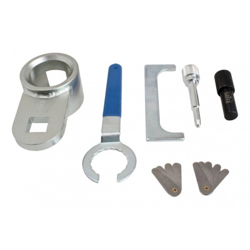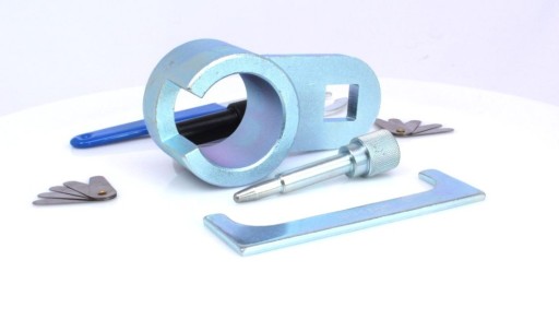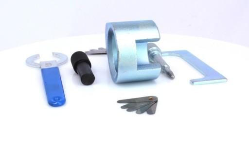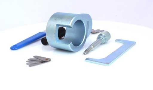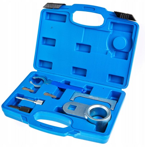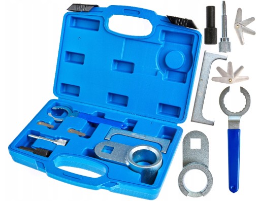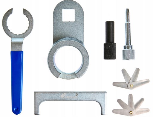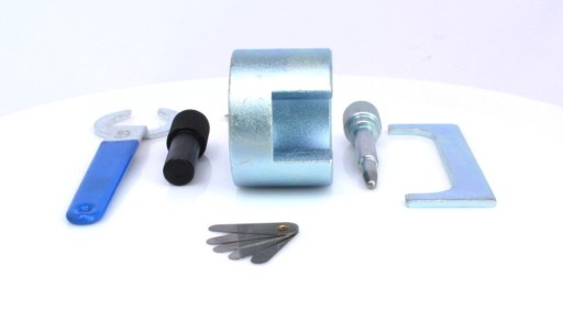 - Zestaw zawiera narzędzie do przytrzymywania koła pasowego wału korbowego, płytkę ustalającą wałka rozrządu, pompę wtryskową i sworznie blokujące wał korbowy oraz regulator napinacza.