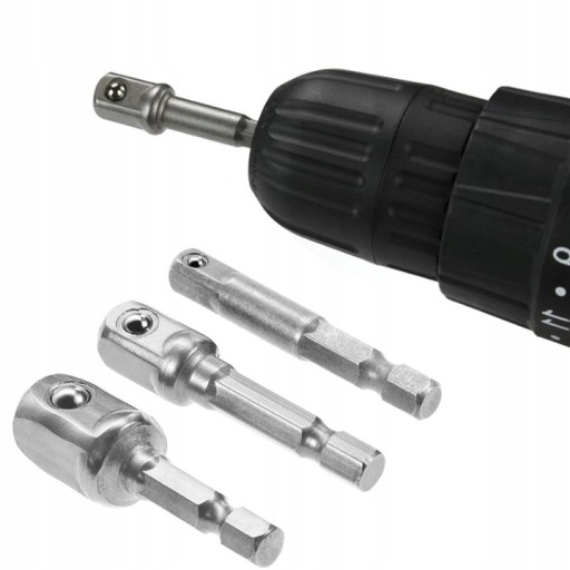 Zestaw adapterów z uchwytem sześciokątnym 1/4” przeznaczonych do konwersji standardowej wiertarki lub wkrętarki do klucza nasadowego.