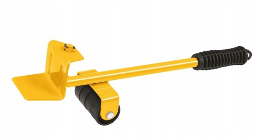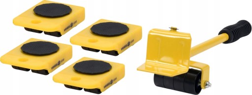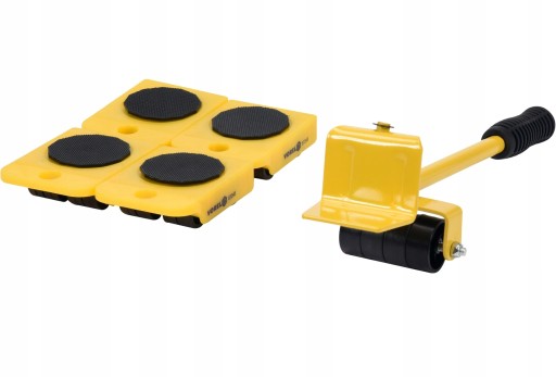 Plastikowe podstawki z rolkami przeznaczone do transportu i ustawiania mebli lub innych ładunków o ciężarze do 150 kg. Stalowa dźwignia służy do uniesienia ładunku przed wsunięciem podstawek z rolkami .
