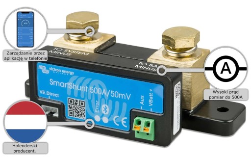 Urządzenie Smart Shunt Victron Energy jest zaawansowanym monitorem akumulatorów żelowych, AGM oraz tradycyjnych. Umożliwia monitorowanie wielu parametrów takich jak napięcie, prąd, moc, ilość cykli akumulatora oraz wiele więcej. Łączność zapewnia wbudowany moduł bluetooth przesyłając wszystkie istotne dane pomiarowe.