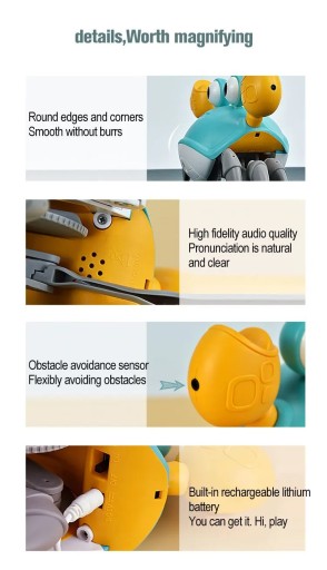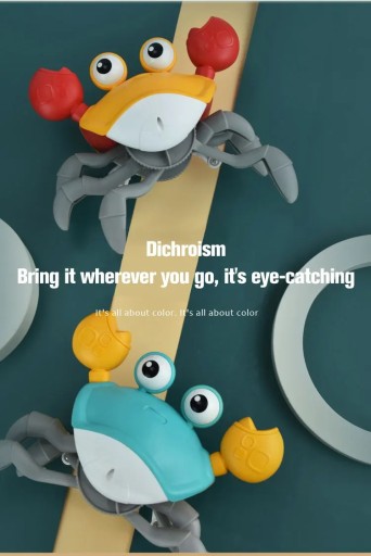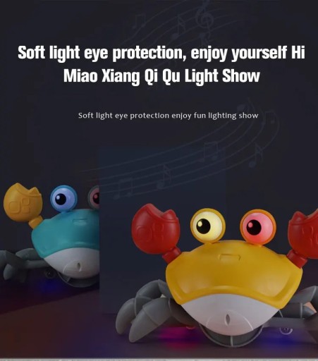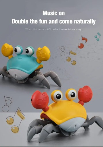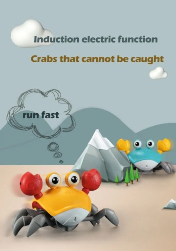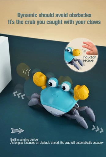 �Pełzające zabawka dla dziecka kraba: porusza się szybko, skacze na boki jak prawdziwy krab, odtwarza zabawne dźwięki i muzykę oraz świeci. Posiada czujniki, które odwracają jego kierunek, gdy zbliża się do przeszkody.