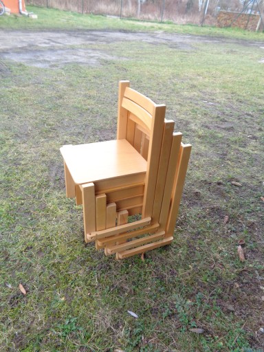 Krzesełka drewniane, noszą niewielkie, naturalne slady użytkowania, bez uszkodzeń mechanicznych.