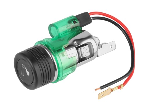 Gniazdo zapalniczki z zasilaniem 12V (samochody osobowe i busy). Zielone podświetlenie daje wyjątkowy efekt. Żarnik został pokryty gumą.