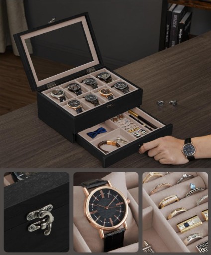 - [Duże okienko z przezroczystego szkła] Przezroczysta szklana pokrywa pozwala wyeksponować kolekcję zegarków, chronić ją przed kurzem i szybko znaleźć odpowiedni zegarek pasujący do wybranego stroju w gorączkowy poranek