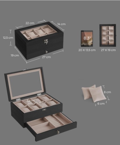 - [Duża pojemność i 2 poziomy przechowywania] Górny poziom z 8 przegródkami na zegarki, dolny poziom z przegródkami o różnej wielkości na paski do zegarków, pierścionki i spinki do mankietów - zapewnij dobry porządek zarówno zegarkom, jak i biżuterii