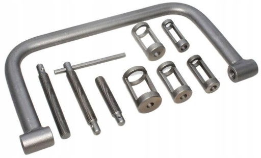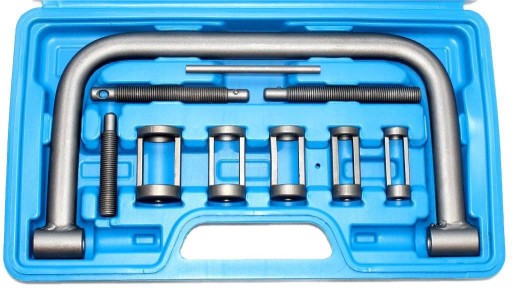 Opis narzędzia: Przyrząd z wymiennymi adapterami do ściskania sprężyn zaworowych. W zestawie pięć adapterów o różnej średnicy. Szczypce do demontażu uszczelniaczy zaworowych.
