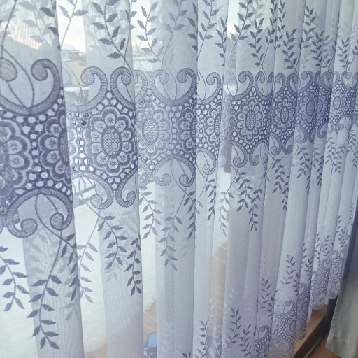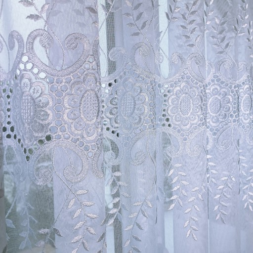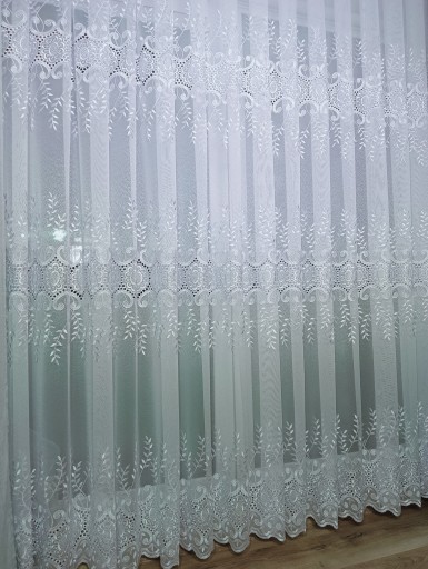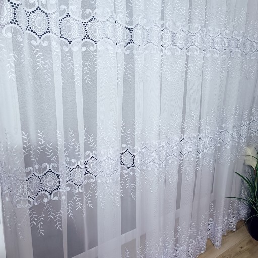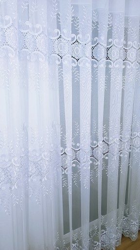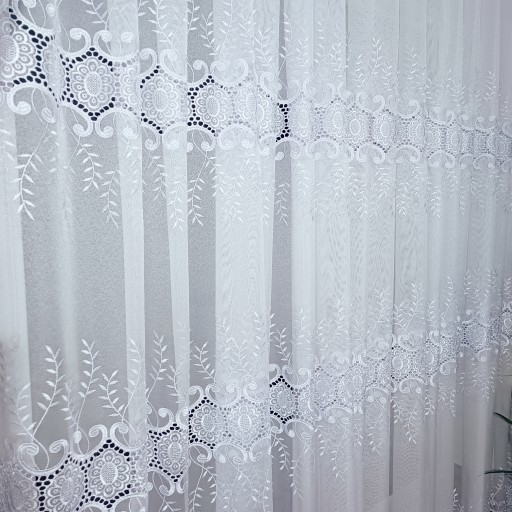 Piękna firana markizeta haftowana o wys. 250 cm. Posiada trzy pasy zdobień. Wykonana z wysokiej jakości przędzy o dużej gramaturze. Gruby i niesamowicie ładny wzór stanowi efektowną aranżację okna. Posiada przepiękny kolor bieli a haft niesamowicie błyszczy przez co firana wygląda cudnie na oknie, wewnątrz jak i z zewnątrz . Firana prezentuje się najlepiej namarszczona w zakresie 1:2.