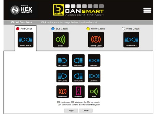- Wybór funkcji obwodu — Wybór funkcji obwodu w oprogramowaniu CANsmart umożliwia uruchomienie dowolnego wybranego akcesorium w dowolnym z czterech obwodów. Kliknij ikonę obwodu, aby otworzyć menu rozwijane i dokonać wyboru z listy dostępnych funkcji obwodu.