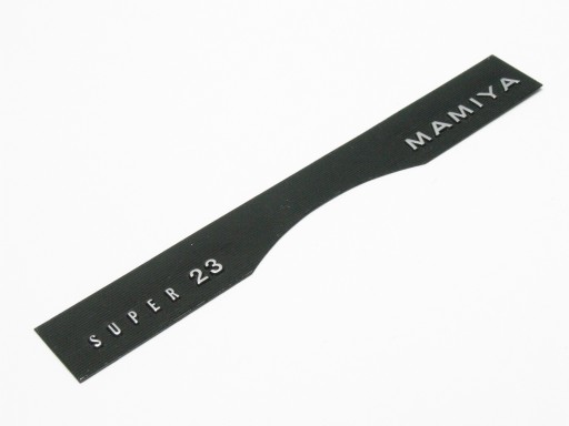 Płytka z nazwą z frontu Mamiyi Super 23 - nowa, oryginalna część zamienna; pochodzi prosto od producenta, nie z demontażu; posiada ślady przechowywania.