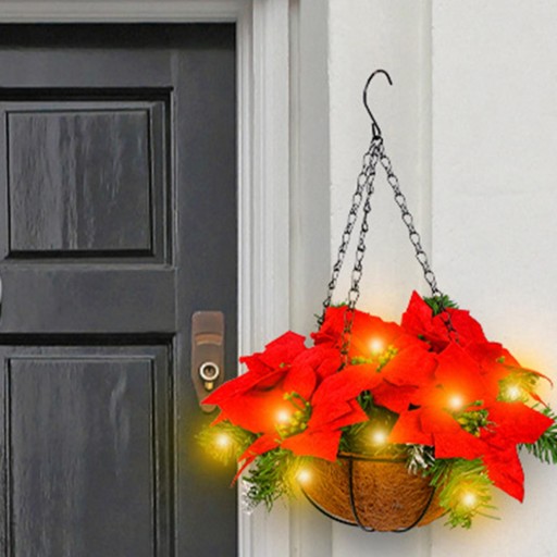 [Dekoracja domu]: Wiszący kosz na świąteczne kwiaty ze światłami, z mocnymi elementami bożonarodzeniowymi, może dodać silnej świątecznej atmosfery do Twojego domu, czyniąc go coraz cieplejszym.
