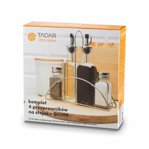 Solniczka i pieprzniczka Tadar Ponte 30 ml to dwa przyprawniki kuchenne ze szkła. Zamknięcia mają stalowe. Zakrętki wyposażono w otwory, dzięki którym zwiększysz komfort i precyzje doprawiania potraw, a nawet kanapek. Sprawisz również, że na stole zawsze będzie mogła stać sól i pieprz. Solniczka i pieprzniczka Ponte są przezroczyste. Na czas uzupełnisz ich zawartość, bo łatwo zauważysz, że się kończy. Co więcej, zadbasz o higienę przechowywania 2 przypraw w swojej kuchni – niekoniecznie muszą to być przecież sól i pieprz.