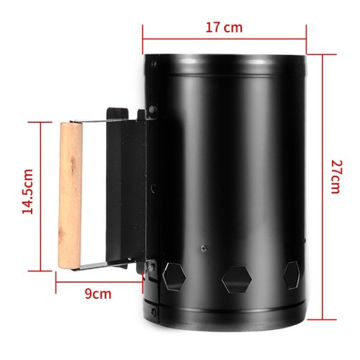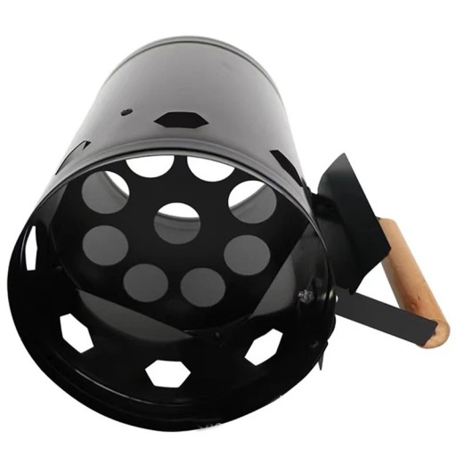 Nowy, komin do rozpalania węgla, brykietu na grilla. Skuteczny sposób na szybkie i łatwe rozpalenie grilla. Urządzenie zwiększa Twoje bezpieczeństwo - nie musisz stosować sztucznych podpałek, które zmieniają smak potraw i zawierają szkodliwe substancje chemiczne. Komin posiada specjalne otwory wentylacyjne, zapewniające idealny przepływ powietrza. Idealnie wyprofilowana drewniana rączka chroni przed poparzeniem po nagrzaniu komina.
