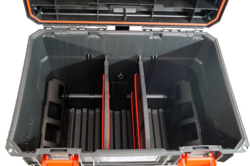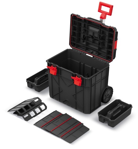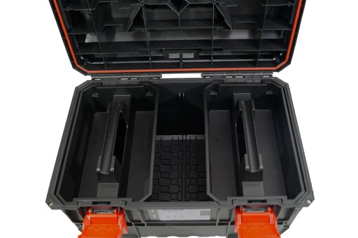 Skrzynka narzędziowa (moduł jezdny) X Block PRO KXB604050 marki Kistenberg posiada 2 nosidła, 2 uchwyty na narzędzia ręczne i 2 wyjmowane przegrody do aranżacji przestrzeni wewnętrznej.