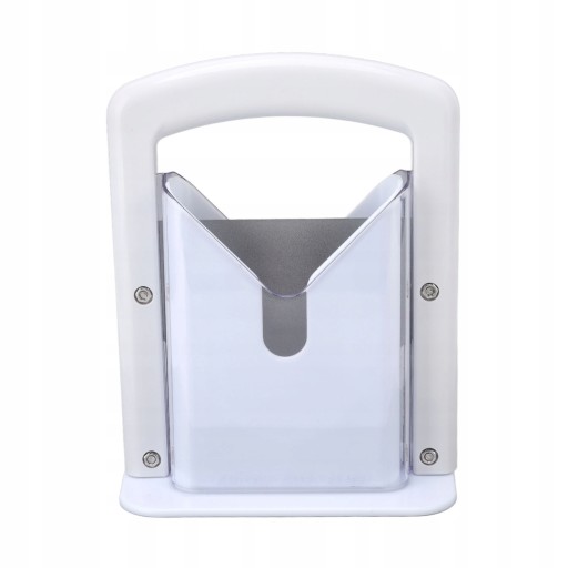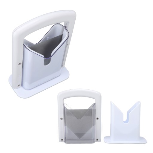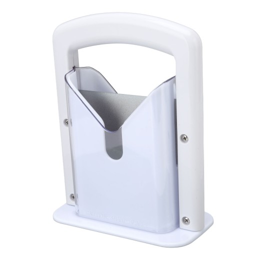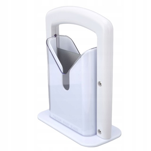 3. OSŁONY BEZPIECZEŃSTWA: Podstawka bajgla utrzymuje bajgiel, podczas gdy dwie przezroczyste osłony zabezpieczające trzymają palce z dala od ostrza nakłuwającego.