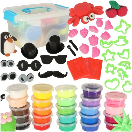 W zestawie znajduje się 24 kolory piankoliny (po 15g każdy), zestaw akcesoriów (patyczki, foremki, styropianowe kuleczki) oraz plastikowe pudełko do przechowywania.