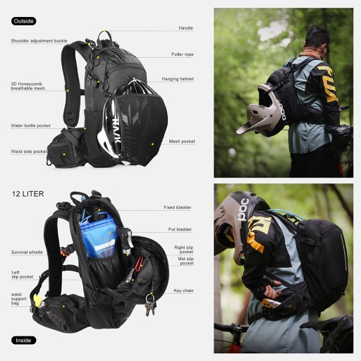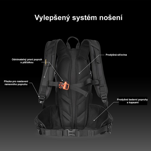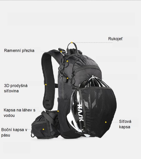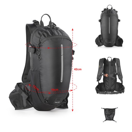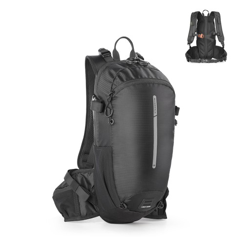 Uniwersalny plecak rowerowy z wyściółką pleców, który może być również używany do narciarstwa biegowego i innych sportów. Posiada odpinaną siatkę do przenoszenia kasku rowerowego. Plecak jest podzielony na dwie główne kieszenie. Większa kieszeń plecaka ma trzy mniejsze kieszenie do przechowywania małych przedmiotów. Plecak posiada również karabińczyk do przypięcia kluczy. Plecak posiada regulowane paski na ramiona oraz pasy piersiowy i biodrowy dla bardziej stabilnego zamocowania plecaka podczas jazdy. Na klamrze pasa piersiowego znajduje się zintegrowany gwizdek. Do plecaka można włożyć bukłak z piciem (brak w zestawie). W dolnej części plecaka znajduje się pętla do mocowania latarki.