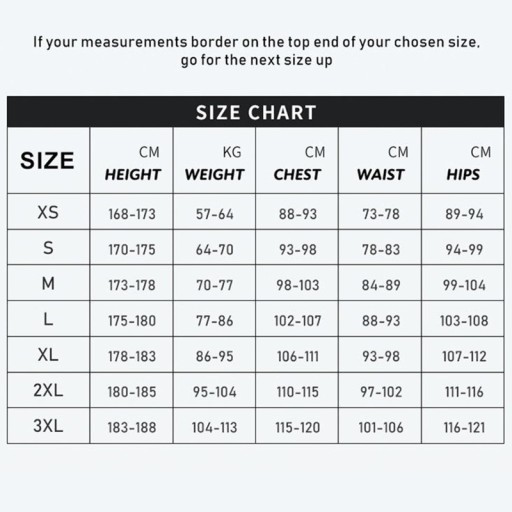 2xl: odpowiednia wysokość: 180-185 cm, odpowiednia waga: 95-104 kg, biust: 110 cm-115 cm/43.31-45.28 cala, talia: 97 cm-102 cm/38.19-40.16 cala, biodro: 111 cm-116 cm/43.70-45.67 cala;