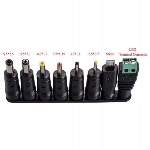 - W zestawie 8 wymiennych końcówek złączy, odpowiednich do 95% wszystkich urządzeń gospodarstwa domowego AC / DC.
