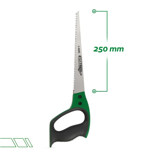 Długość piły to aż 250 mm, co pozwala na wykonywanie głębszych otworów. Wygodny uchwyt zapewnia komfortowe dopasowanie do dłoni, dzięki czemu praca jest łatwiejsza.