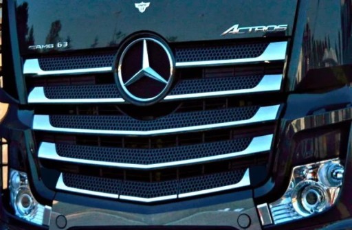 Nakładki na fabryczny grill wykonane ze stali nierdzewnej (lustro). Montaż na taśmie dwustronnej (jest w zestawie). Przeznaczone do samochodów MERCEDES ACTROS MP4 szeroka kabina.