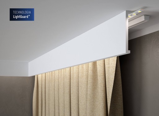Listwa karniszowa to subtelny, ale efektowny element wykończeniowy, stosowany wewnątrz pomieszczeń. Montowany na linii sufitu w okolicy okna, pozwala na szybkie i proste zamaskowanie szyny lub drążka oraz dodanie niewymuszonej elegancji Twojemu wnętrzu. W ten sposób ukryty karnisz nie tylko nie odwraca niepotrzebnie uwagi od wnętrza, ale również może stanowić istotny element aranżacji, podkreślając wybraną stylistykę pomieszczenia. W naszej ofercie posiadamy listwy o długości 240 oraz 200cm i szerokości 10, 12, 15, 18cm