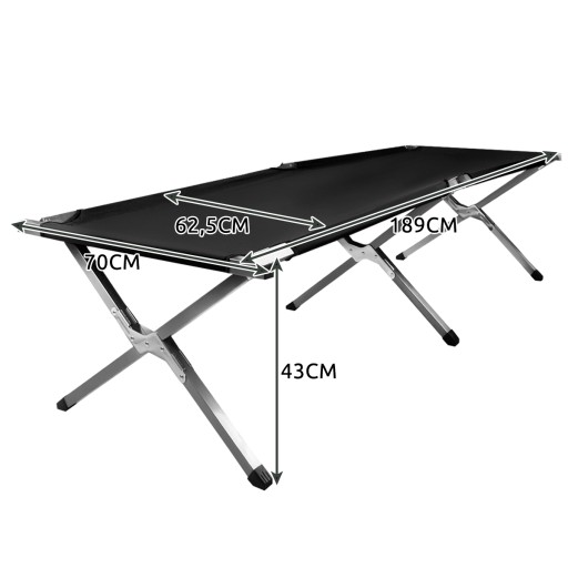 - SPECYFIKACJA – kolor: czarny; konstrukcja: metal; materiał: pokrycie: tkanina oxford 600D, stelaż: żelazo + elementy PP) + pokrowiec (dominujący materiał: tkanina oxford 600D, pozostałe: PP; max. obciążenie: 110 kg; szerokość materiału: 70 cm; wymiary: 189 x 70 x 43 cm; waga: 6,25 kg; waga w opakowaniu: 7 kg.