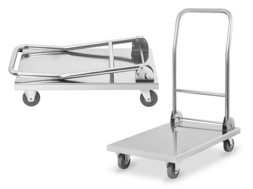 Wózek platformowy nadający się do transportu ciężkich przedmiotów o maksymalnej wadze 400 kg. Dzięki temu model RCFT-1.1 sprawdzi się np. w magazynach, sklepach, hurtowniach i hotelach. Sprzęt wykonano z solidnej stali szlachetnej. Posiada składaną rączkę i obszerną platformę. Wózek wyposażono w 4 koła z termoplastycznej gumy, które zapewniają ciche przemieszczanie i odporność na wstrząsy. Bezpieczeństwo eksploatacji gwarantują zaokrąglone krawędzie.