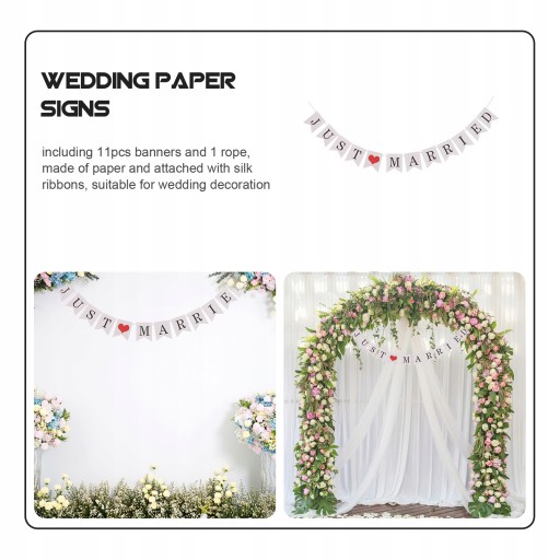 Ten przedmiot to zestaw papierowych tabliczek ślubnych, w tym 11 szt. Banerów i 1 lina, wykonany z papieru i przymocowany jedwabnymi wstążkami, odpowiedni do dekoracji ślubnych.