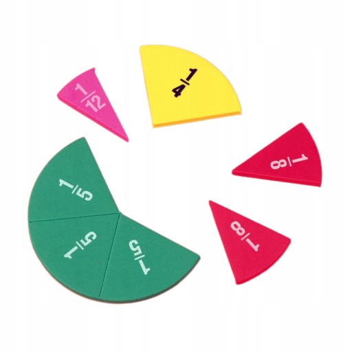 - okrągłe puzzle podzielone: 1, 1/2, 1/3, 1/4, 1/5, 1/6, 1/8, 1/10 i 1/12,