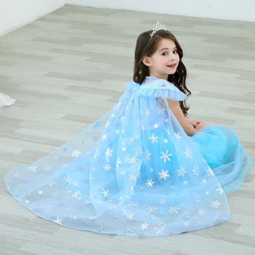 Płaszcz jest dokładnie taki jak na prezentowanych zdjęciach. Kostium jest przepiękny, zdobią go zimowe nadruki lodowych kryształków, z tyłu od ramion ma szyfonowe zwiewne szarfy.