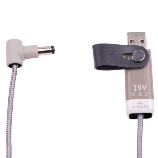 Kabel zasilający USB Ripcord irlandzkiej marki myVolts o napięciu wyjściowym 19V DC i dokładnie takim wtyku i parametrach zasilania, jakich wymaga kontroler Akai MPC One, umożliwiający zasilanie tego urządzenia bezpośrednio z dowolnego standardowego portu USB (np. w powerbanku, laptopie, zasilaczu z wyjściem USB itp.) podającego prąd o odpowiednio wysokim natężeniu wyjściowym.